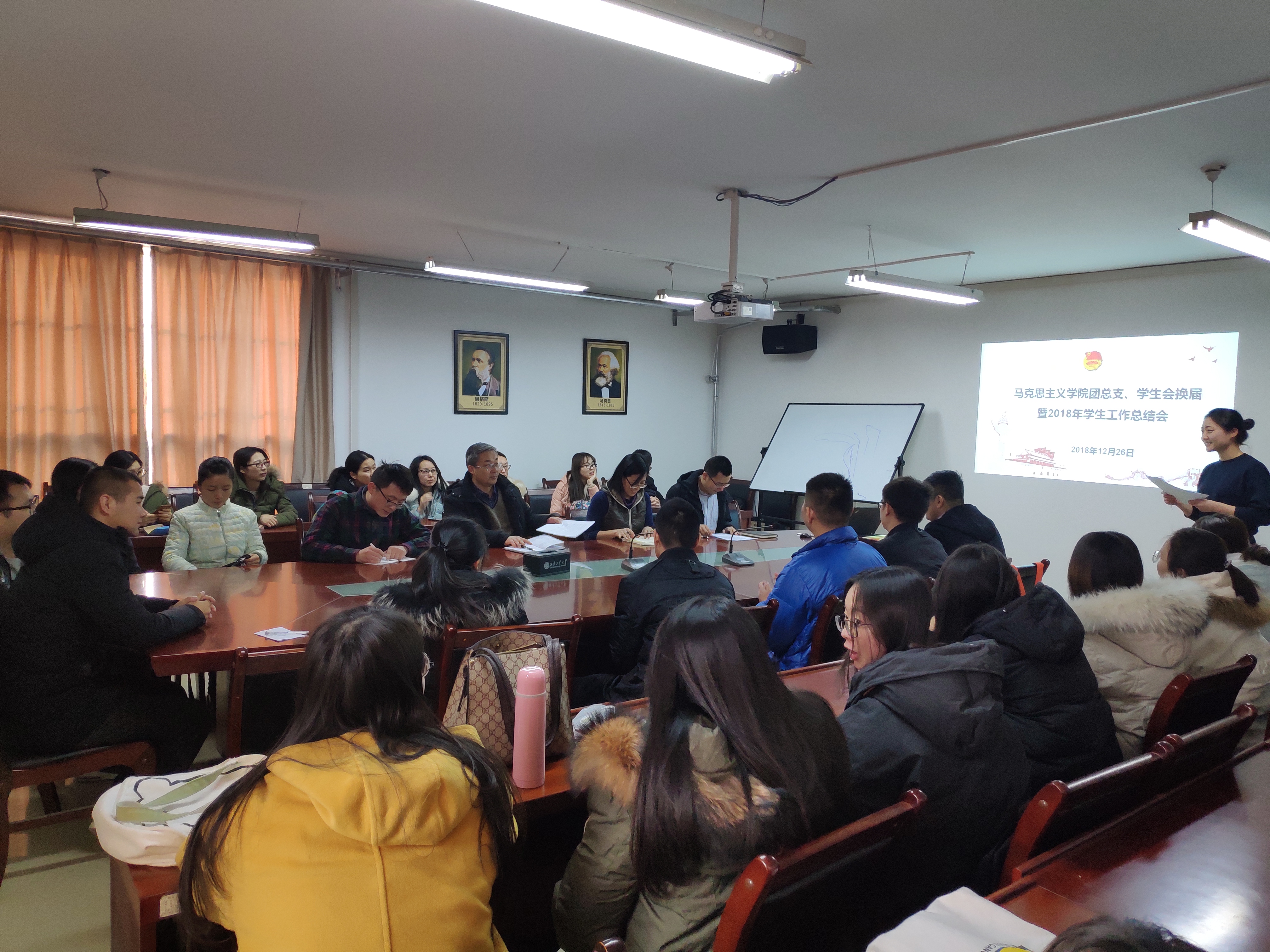 2018年12月26日下午,beet365在行政楼623召开团总支部、员工会换届和2018年员工工作总结会,参加会议的有马克思主义公司党委书记李晓彤、团委书记陈泊蓉及2017级、2018级全体研究生。