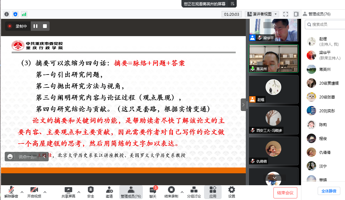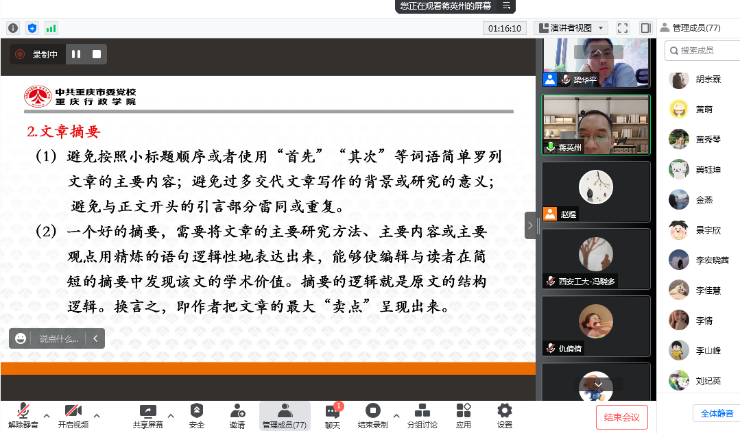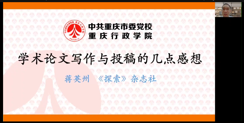 622日,beet365邀请中共重庆市委党校《探索》杂志编辑部蒋英州教授在线上腾讯会议平台为公司全体师生做了题为“学术论文写作与投稿的几点感想”的学术讲座,此次为beet365 “精彩学术观”系列学术讲座第十六讲。讲座由公司副经理梁华平主持,公司全体师生参加了此次学术活动。