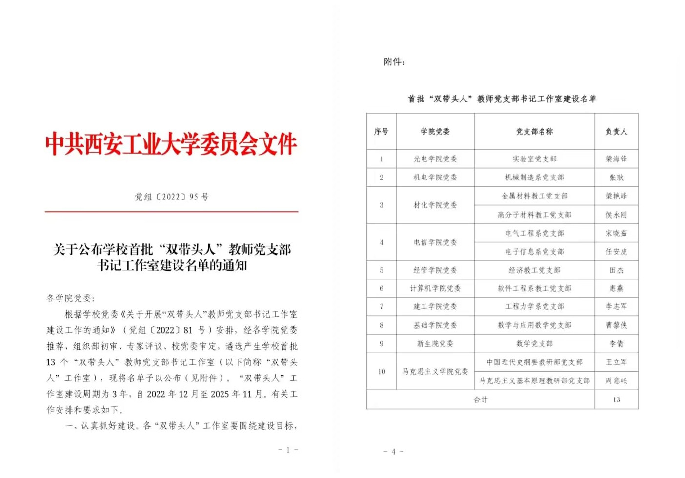 这次公布的首批“双带头人”工作室建设周期为3年,自2022年12月至2025年11月。建设期间,工作室要围绕建设目标、任务、标准,创新工作方法、平台载体,创立典型示范,发挥党支部战斗堡垒作用和党员先锋模范作用,引领带动本公司党建工作质量整体提升,特别是要围绕立德树人根本任务,强化政治和组织功能,以党建引领师德师风建设、师生思想政治工作,发挥教育管理监督党员和组织宣传凝聚服务师生的作用,积极推进党建工作和业务工作深度融合,将党建优势转化为教学科研优势,引导广大党员教师在教学科研中争创一流业绩。