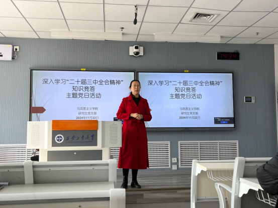 为进一步深入学习贯彻党的二十届三中全会精神,深刻领会全会提出的新思想、新观点、新论断,beet365研究生第一、第二党支部于2024年11月22日下午在教7-312教室联合开展“深入学习党的二十届三中全会精神知识竞答主题党日活动”。活动由研究生第一党支部书记杨婧老师主持,两个支部的研究生党员、发展对象、积极分子参与本次活动。