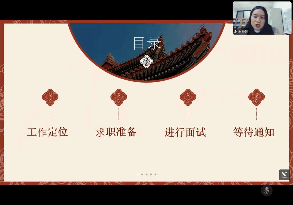 王婷婷从“工作定位”、“求职准备”、“进行面试”、“等待通知”四方面重点向师弟师妹们分享就业经验。她说到,要关注目标城市以及自身情况,随时浏览、查看关注岗位的招聘信息。详细讲述了自身就业经历,列举了高校教师、导员面试时相关的重点问题。