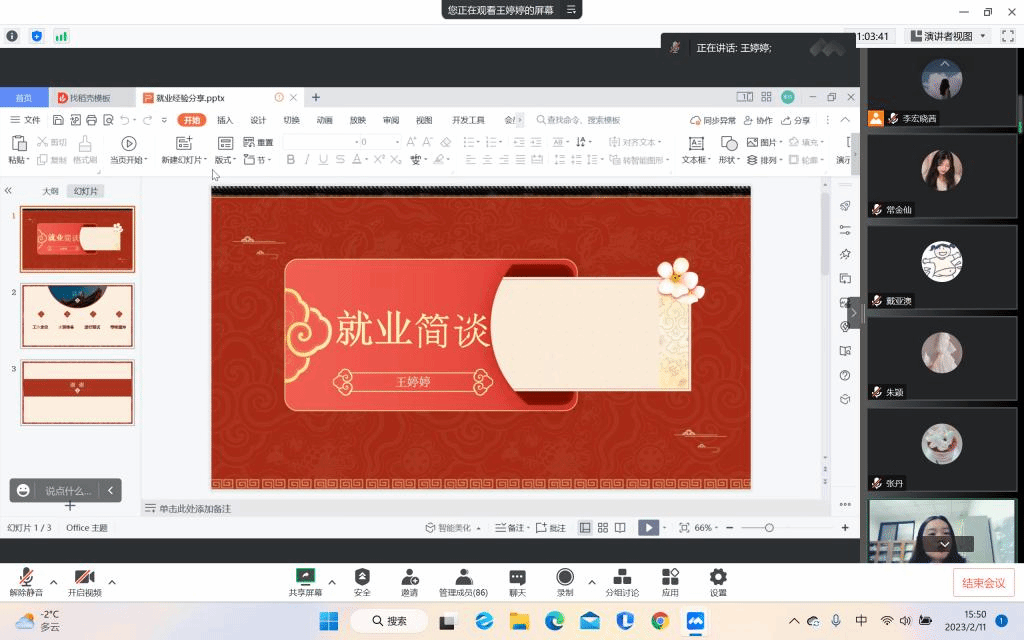 2023年2月11日下午,beet365开展寒假就业分享会。本次会议通过腾讯会议平台线上开展,公司党委副书记李明芳、辅导员王亚茹以及公司全体研究生参与。本次会议由公司员工会主席李宏晓茜主持,本次会议邀请到三位曾就读于公司的优秀硕士毕业生张鑫、张丹、王婷婷,为同学们进行了就业指导和相关经验分享。