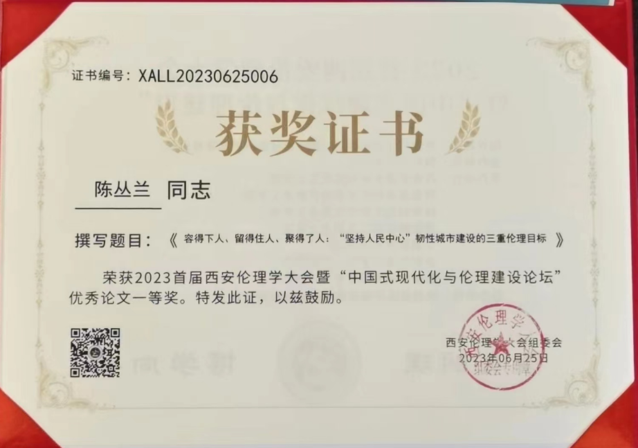 此次大会是陕西省学人学习贯彻党的二十大精神、积极回应“中国式现代化”内在要求等重大现实关切,为深化我省新时代伦理道德理论与实践问题的研究而召开的首次伦理学大会。来自西安交通大学、西北工业大学、陕西师范大学等几十所高校、研究机构和医院的200余位专家学者,以及西安广播电视台、《中国医学伦理学杂志》等多位媒体人出席了此次大会。与会专家学者就伦理学基础研究、科技伦理、人工智能、建筑伦理、企业伦理、医学伦理等当代主流话题进行主旨发言。作为特邀专家,陈丛兰教授对第一阶段的主旨报告,结合应用伦理学的最新研究趋势进行了评议。她向此次大会提交的参会论文《容得下人、留得住人、聚得了人:“坚持人民中心”韧性城市建设三重伦理目标》荣获优秀论文一等奖。